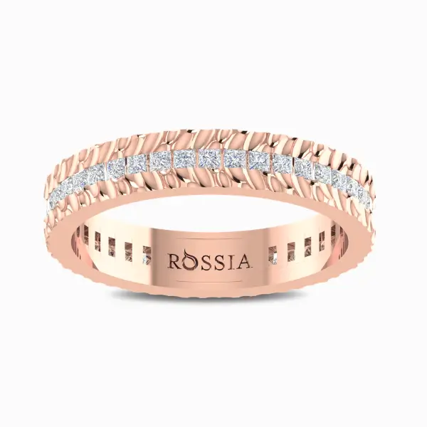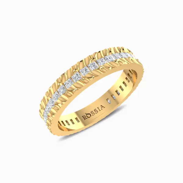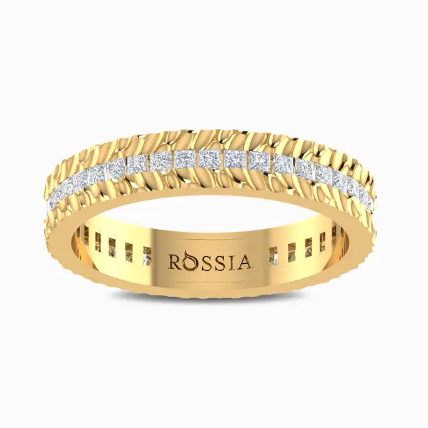 Watch her eyes light up when you present her with this pristine Princess Cut Solitaire Diamond Wedding Band. Express your once-in-a-lifetime kind of love with this dainty textured wedding band. Intricately handcrafted with 3.948 grams of gold with 40 Princess Cut diamonds weighing 0.85 carat set with a flush setting.