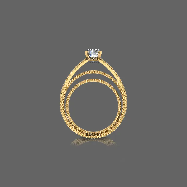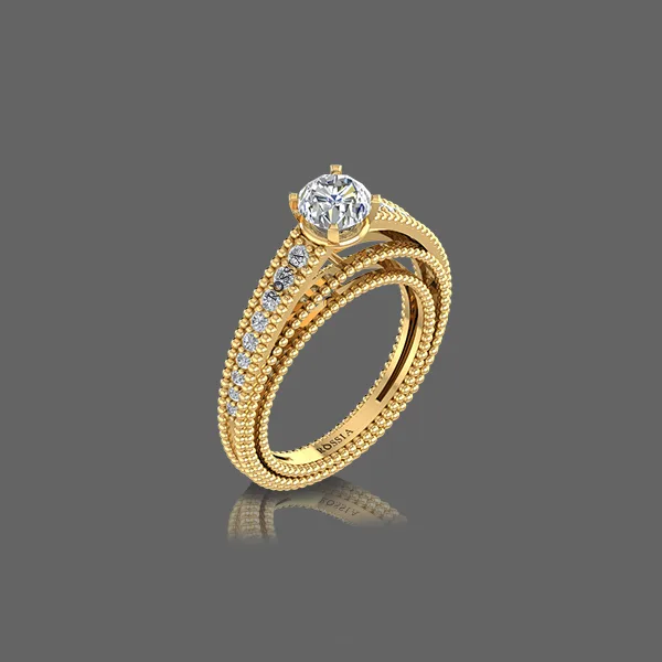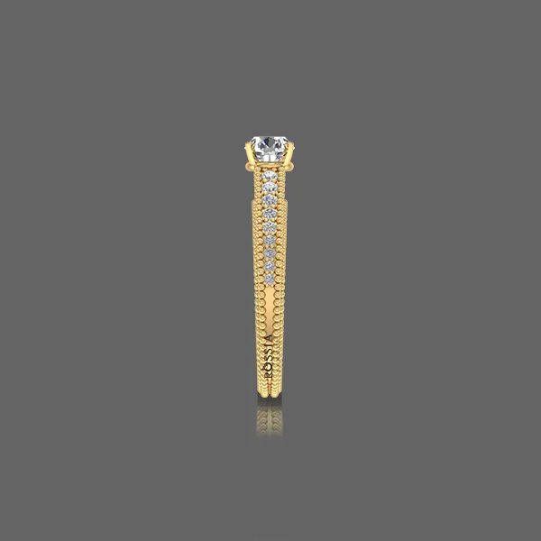Symbolize love as the center of the celestial sphere with this exquisite solitaire diamond ring. Ingeniously crafted in 7.953 grams of gold with 0.80 carat Round Cut solitaire diamond at center, set in prong setting and flanked by 18 Round Cut diamonds, weighing 0.34 carat in pave setting.