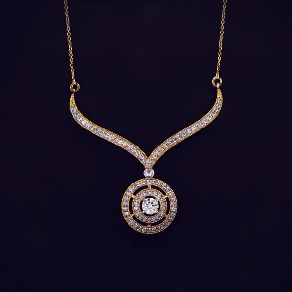 A mangalsutra that gleams like gold, embodying the warmth and radiance of a loving relationship. Meticulously handcrafted in 6.483 grams of gold with a Round Cut diamond weighing 0.40 carat brilliantly set with prong setting and accented with 88 Round Cut diamonds weighing 0.80 carat with prong setting.